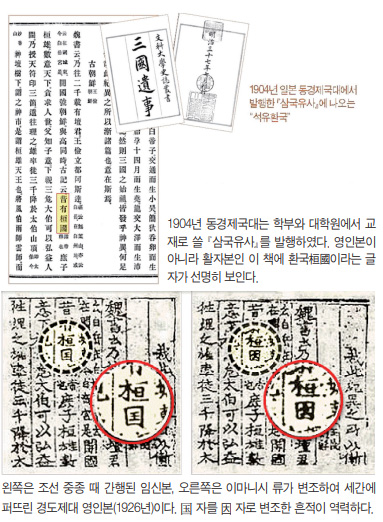 일부 강단사학자 중에는 “『삼국유사』에는 ‘석유환인昔有桓因’으로 기록되어 있다.”며, “‘석유환국昔有桓國’으로 기록된 판본은 오기誤記다.”고 주장한다. 결론적으로 환국은 실재한 나라가 아니라는 주장이다. 하지만 ‘昔有桓國’이나 ‘昔有桓因’이나 둘 다 역사의 진실에 부합한다. 나라가 있으면 당연히 나라의 통치자가 존재한다. 그래서 환인(인물)에 대한 기록과 환국(국가)에 대한 기록이 병존하고, 또 서로 치환置換되어 사용되었다. 『환단고기』에도 ‘昔有桓國’과 ‘昔有桓因’ 기록이 병존한다. 일제는 당시 통용되던 『삼국유사』의 ‘석유환국’ 부분에서 桓國(国)의 ‘國’ 자를 ‘因’ 자로 바꾸었다. 국가에 대한 기록을 개인 인물사로 바꿔 버렸고, 나아가 신화의 역사로 몰고 간 것이다. 이들의 주장대로라면 일제가 역사의 진실을 바로잡아 줬다는 얘기다. 일제에게 감지덕지하며 고마워해야 할 판이다.