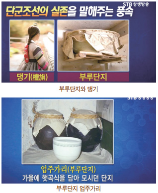 해마다 정월이 되면 질그릇 단지에 쌀을 담아 뒤울안의 박달나무 말뚝 위에 올려놓고 짚으로 고깔을 만들어 씌우고 복을 비는 민간 풍속이 있습니다. 이때 쌀을 담는 단지를 ‘부루단지’라고 합니다. 바로 단군조선 부루단군과 관련이 있는 풍습입니다.