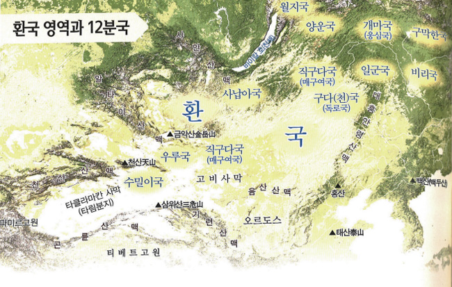 환국은 모두 아홉 족속[九桓]으로 나뉘었고, 이 9환족은 열 두 나라를 이루고 살았다. 12환국의 이름은 이러하다.
