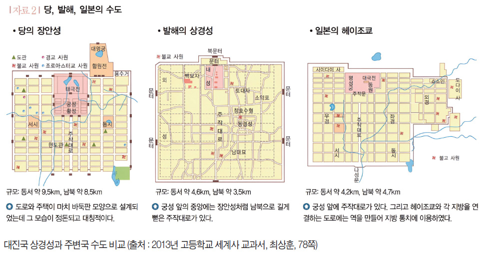 상경의 이런 모양새나 궁성 정문 오봉문에서 황성 정문 오문午門을 지나 외성의 남대문에 이르기까지 직선으로 쭉 이어지는 주작대로朱雀大路가 도성의 중심이 된 점 등은 당의 장안성을 모방했다.